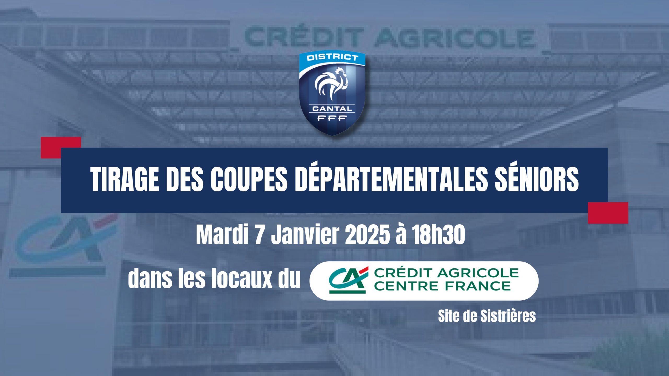 Le District du Cantal de Football organise le mardi 7 janvier 2025, le tirage de ses coupes départementales, dans les locaux du Crédit Agricole Centre France d’Aurillac, son partenaire emblématique....