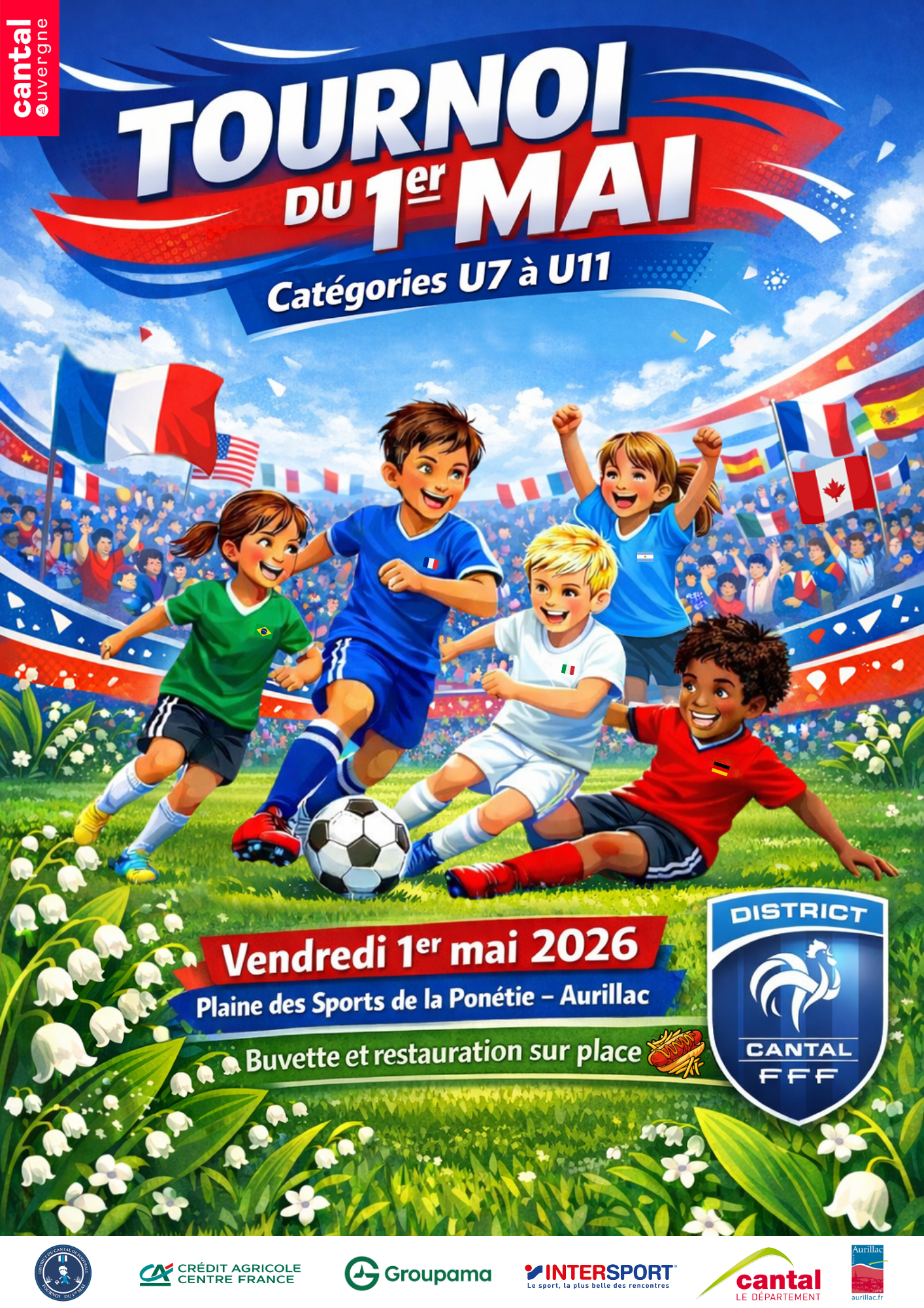 Le vendredi 1er mai 2026, la Plaine des Sports de la Ponétie à Aurillac accueillera la 49ème édition du Tournoi du 1er Mai, organisée par le District Cantal Football. Cette année, l’événement prendra une dimension encore plus festive avec un thème exceptionnel : la Coupe du Monde 2026 🌍