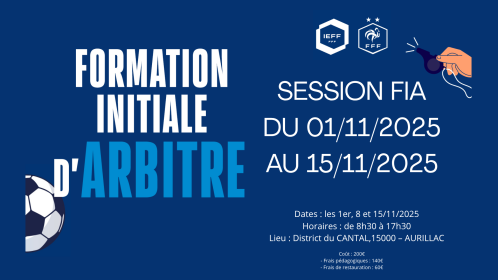 Le District du Cantal de Football organise une nouvelle session de Formation Initiale Arbitre (FIA), ouverte à toutes celles et ceux qui souhaitent s’engager dans l’arbitrage.