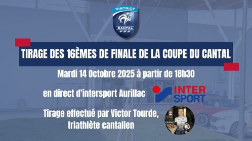 Le tirage au sort des 16èmes de finale de la Coupe du Cantal se déroulera le mardi 14 octobre 2025 à partir de 18h30, en direct depuis Intersport Aurillac.