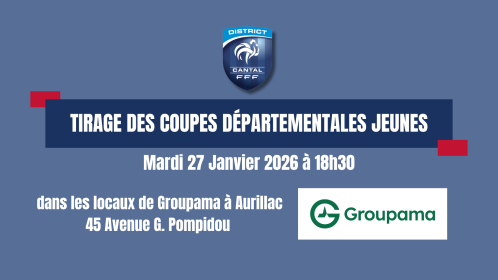 Le District du Cantal de Football organise le mardi 27 janvier 2026 à 18h30, le tirage au sort des coupes départementales jeunes, dans les locaux de Groupama à Aurillac (45 avenue Georges Pompidou).