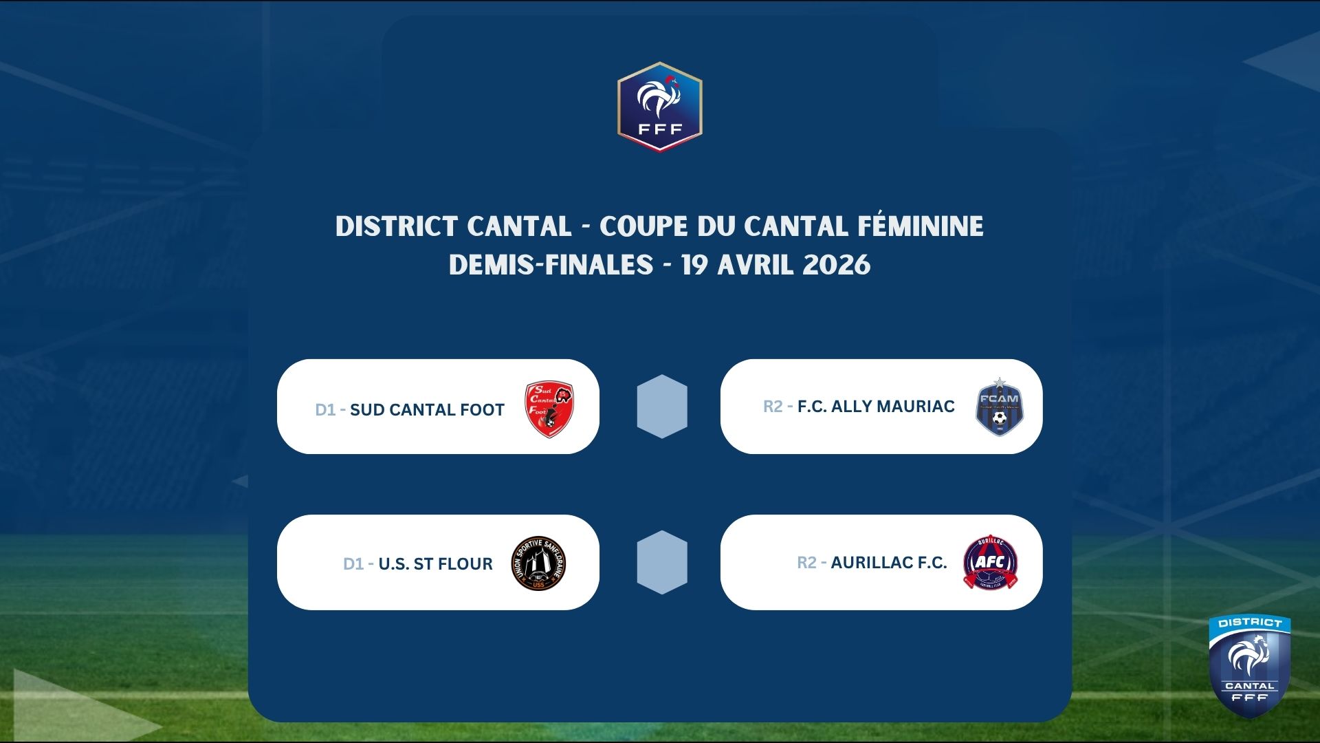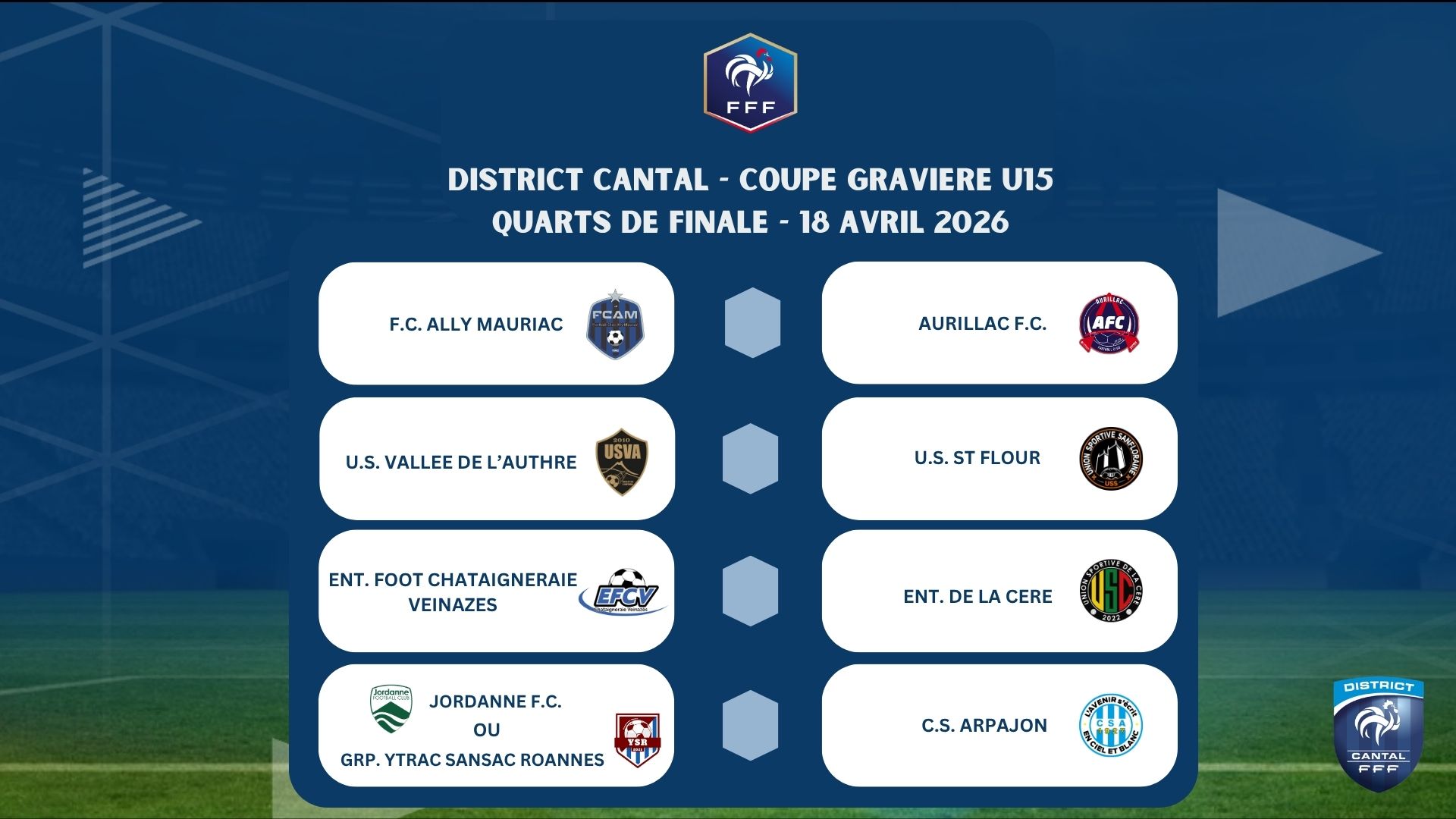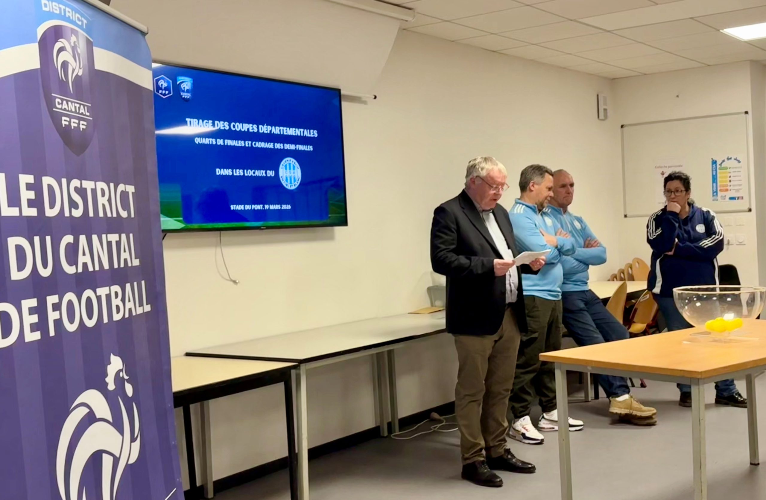 Le tirage au sort des coupes départementales s’est tenu hier, jeudi 19 mars 2026 à 19h00, au club house du CS Arpajon, situé au Stade du Pont. Ce site accueillera également cette année l’Assemblée Générale du District ainsi que les finales de la Coupe du Cantal et de la Coupe Combourieu, prévues le samedi 13 juin 2026.