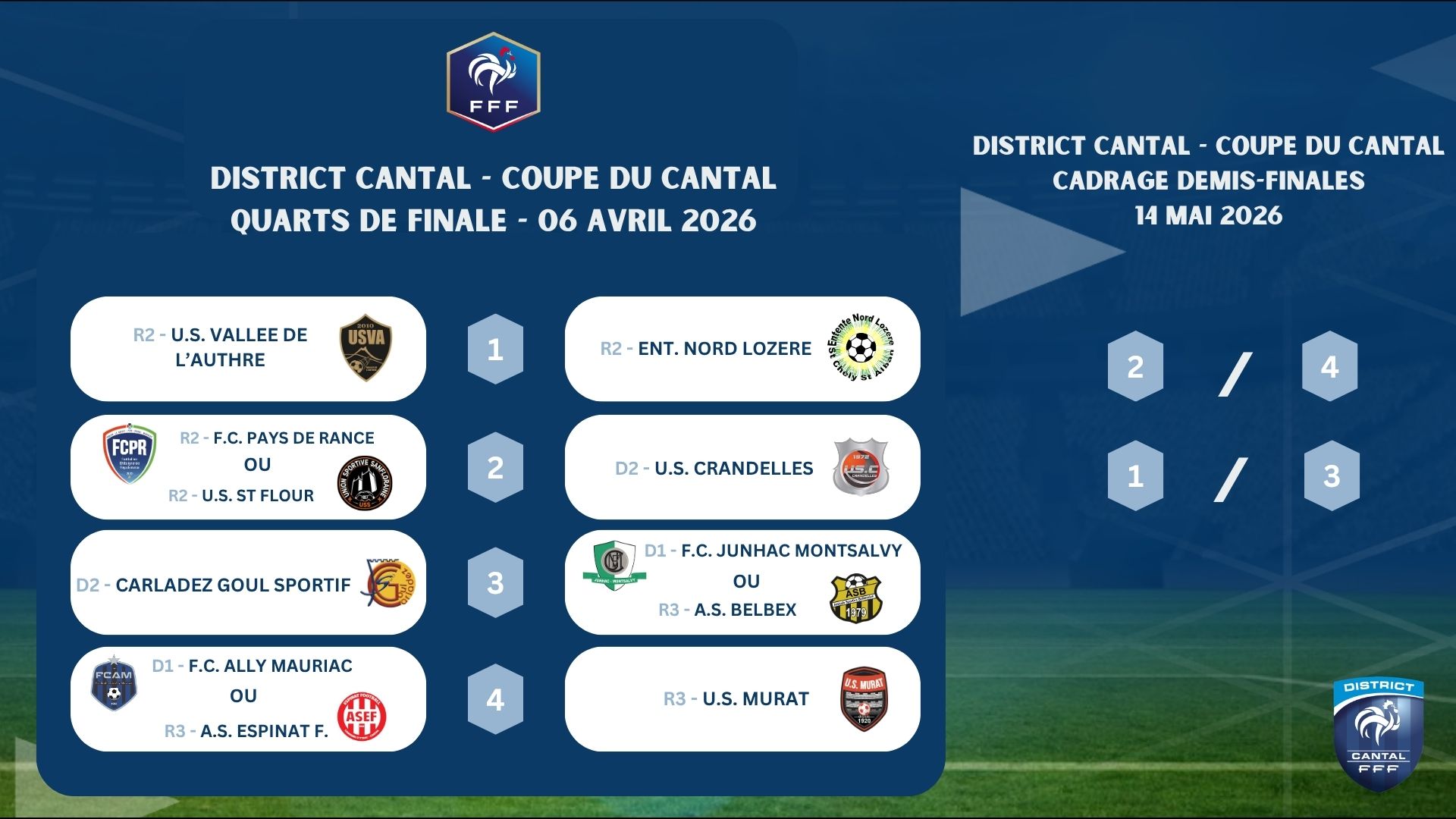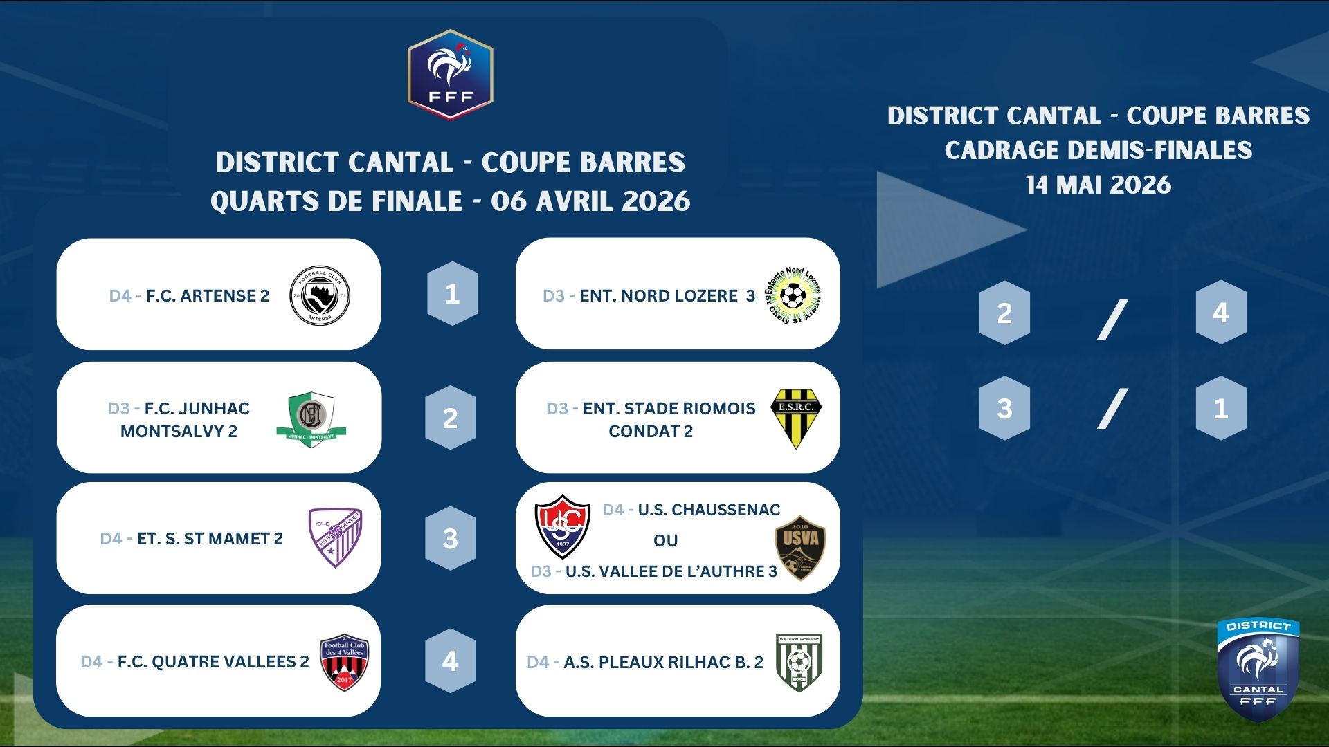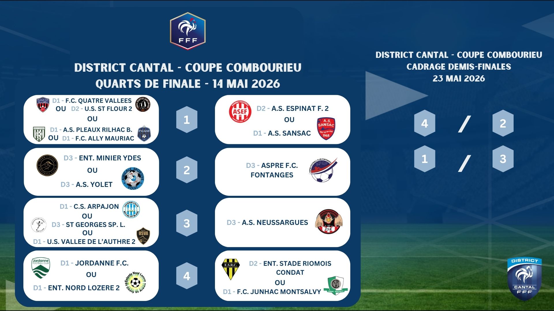 Découvrez ci-dessous les résultats des tirages au sort : quarts de finale de la Coupe du Cantal, Coupe Combourieu, Coupe Barres et Coupe Gravière, ainsi que les demis-finales de la Coupe du Cantal Féminine.